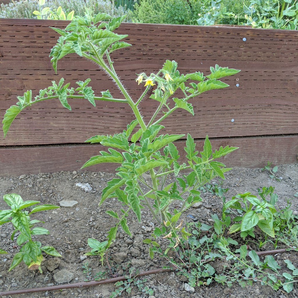 This is a Chadwick Cherry tomato, planted from seed I bought early in the pandemic from RedwoodSeeds.net. Isn’t it doing nicely? Look at those blossoms! That sturdy stem! The equally nice little basil plants to either side! (Ignore the weeds. Nothing to see there. Focus on the basil!)