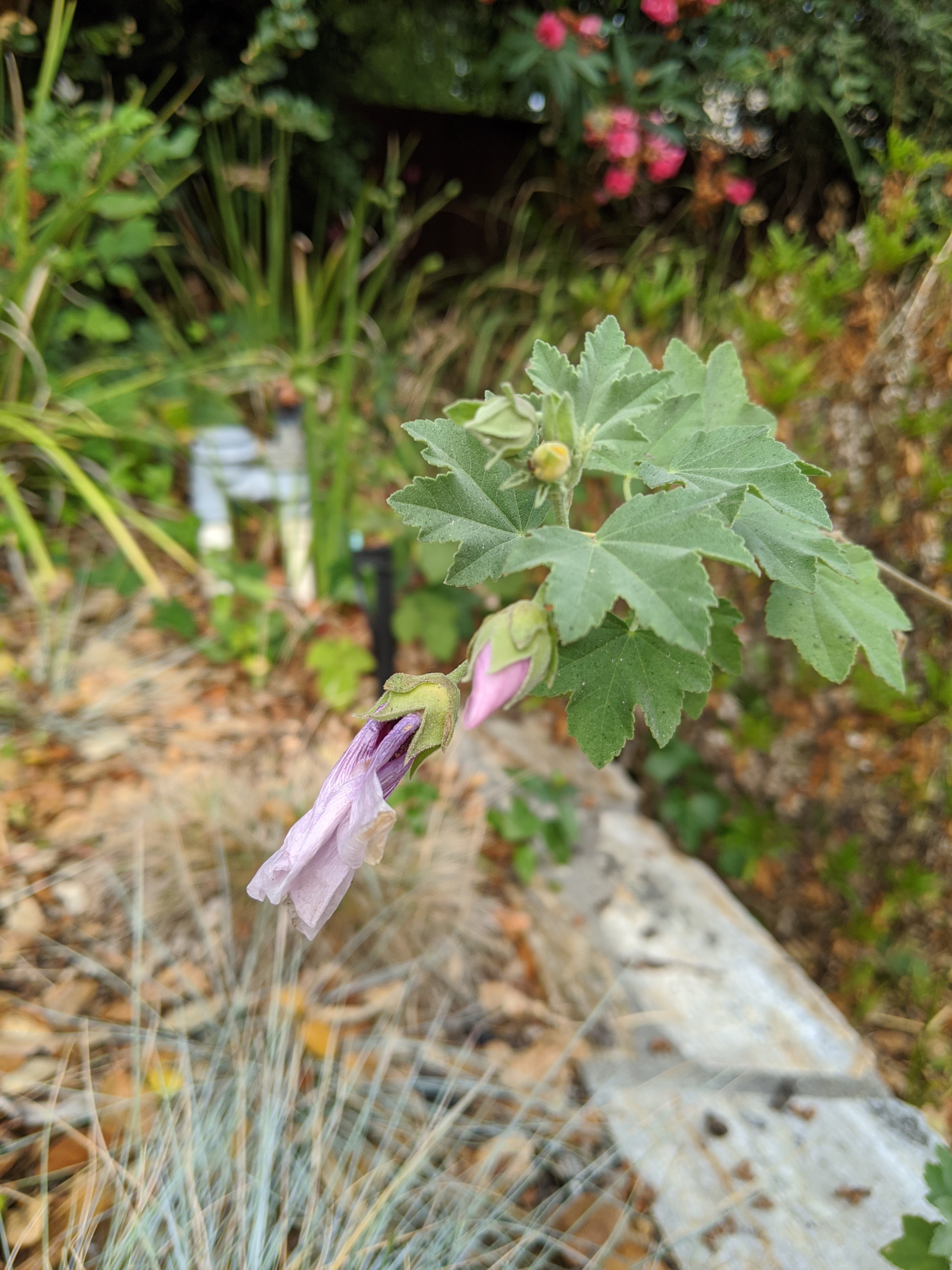 1. This is a lavatera maritima, a gorgeous tree mallow that I got the last time I was at a garden store; it’s still in a pot. In the morning its flowers stay closed, but they open in the afternoon to gorgeous purple blooms. I may get it in the ground tomorrow, or if not, next week. It’s going to replace a hibiscus which is struggling badly (I think the hibiscus needs more water and less clay-ish soil than is realistic here).