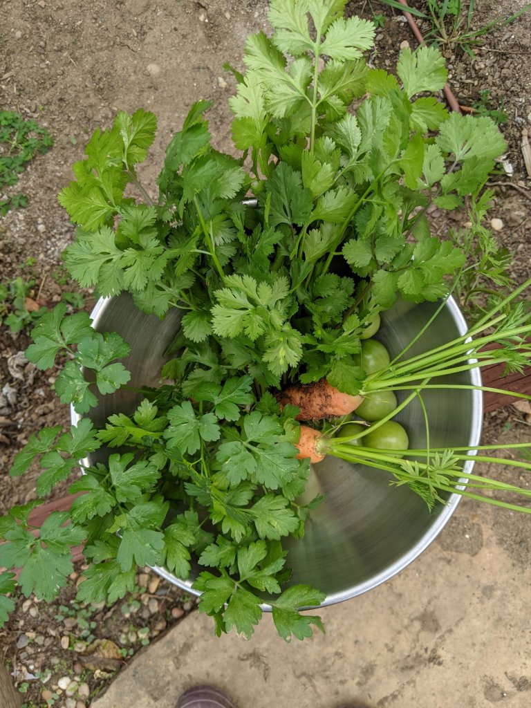 Recent harvest bounty included green tomatoes (yes, Chadwicks); cilantro and parsley, which I can now tell apart by looking at the leaves – a personal victory; carrots; and a few first peas.