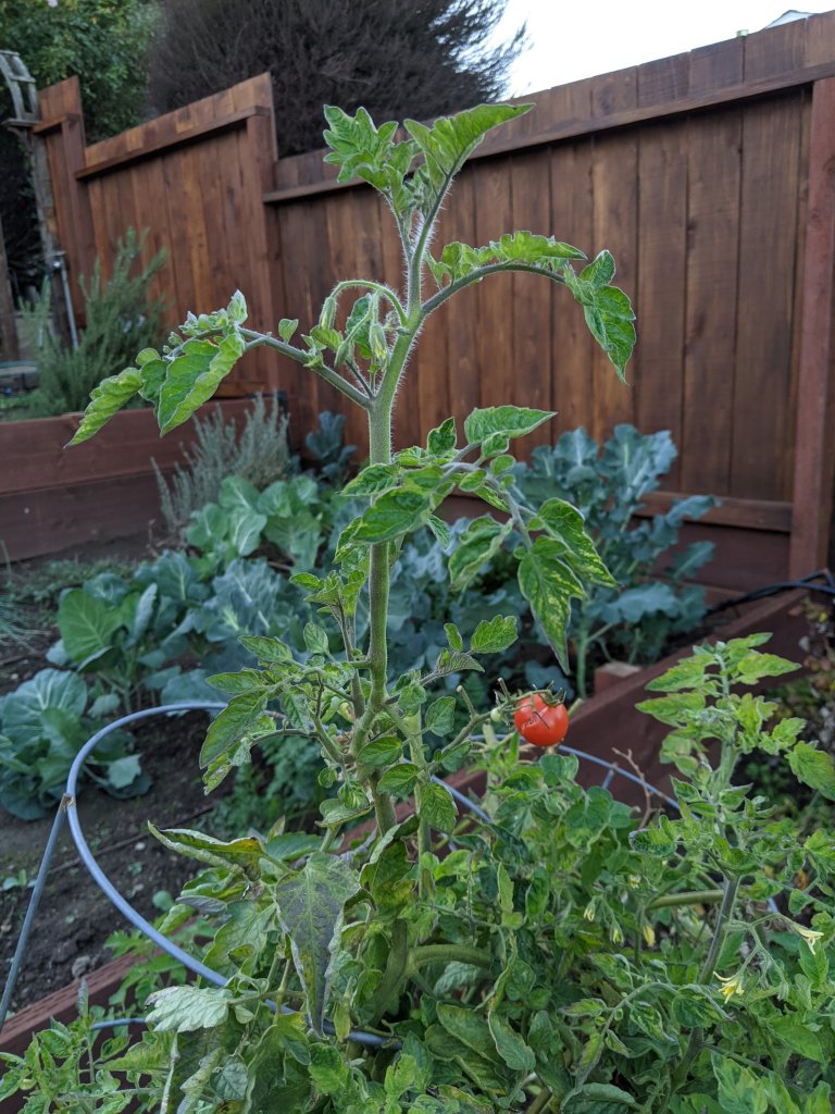 The Chadwick cherry tomatoes I planted back in March are still going – in fact, I ate tomatoes on my hamburger two nights ago courtesy of this plant. I know tomatoes are supposed to die off in winter, but the Chadwick was the earliest starting, latest continuing, sturdiest, and most productive of all the varieties I tried this year. I’m pretty tempted to see if it wants to over-winter and produce next spring.