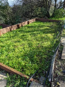 The day started with a low gray drizzle, mist over the southern hills and the sound of dripping echoing in the drainpipes. Mid-morning, however, the weather cleared. I spent the afternoon outside, doing something I think I’d intended to do way back in maybe December: cutting down & digging in my first attempt at cover-cropping.